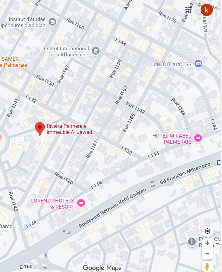 Notre siège est situé à Riviera Palmeraie, non loin du rond-point, dans l'immeuble en face de l'hôpital des Sœurs. N'hésitez pas à nous rendre visite ! Vous trouverez ci-dessous toutes nos coordonnées et nos réseaux sociaux pour nous contacter facilement.